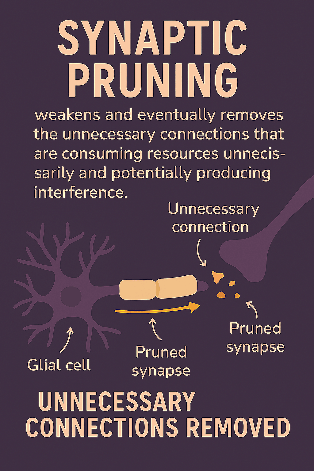 And the finale is when a process called synaptic pruning weakensand eventually removes the unnecessary connections that are consuming resources unnecessarily and potentially producing interference.