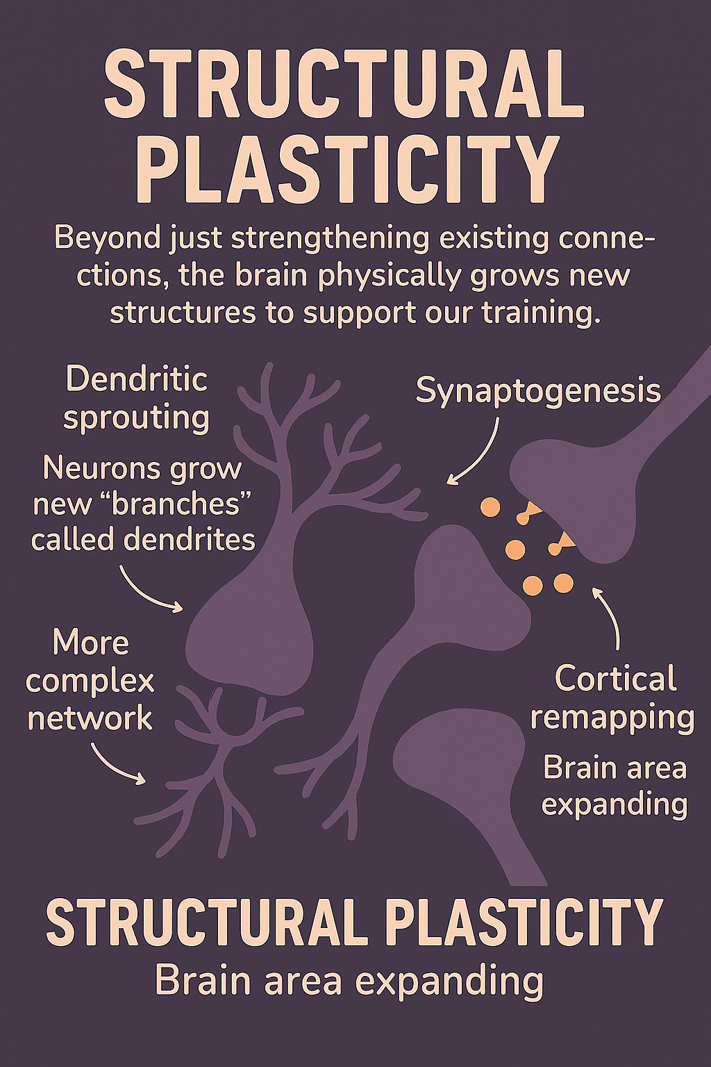 Beyond just strengthening existing connections, the brainphysically grows new structures to support our training. This process is called structural plasticity and has three elements. First, in dendric sprouting, neurons grow new "branches" called dendrites. This increases the surface area available to connect with other neurons, creating a denser, more complex network. Next, with enough practice, the brain will create entirely new synapses between neurons that weren't communicating before. The term for this is synaptogenesis. The third step is called cortical remapping. The specific area of the brain dedicated to that skill can physically expand, borrowing space from neighboring areas that are used less often.
